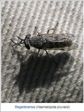 Bremsen (tabanidae), ca. 4000 Arten, sind eine Unterordnung der Fliegen und gehören zu den blutsaugenden Insekten (bis 0,2ml). Sie sind besonders aktiv zwischen April und August an schwülen Tagen. Bremsen werden durch Schweiss angelockt, wobei nur das Weibchen Blut saugt (zur Reproduktion), das Männchen ernährt sich von Nektar. Im Unterschied zu den Stechmücken ist der Stich der Bremse sofort deutlich spürbar, es entsteht ein Juckreiz und blutet weiter auf Grund des durch das Insekt aufgespritzten gerinnungshemmenden Sekretes. Bei Stechmücken entstehen Quaddeln. In Mitteleuropa gibt es eine Generation pro Jahr, erwachsene Tiere leben 2-4 Monate.