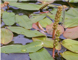 Am Loch 6 gibt es einen Teppich von Blättern auf der Wasseroberfläche zu beobachten. Es handelt sich um das schwimmende Laichkraut. Im Gegensatz zu anderen Laichkräutern hält es sich nicht mit Wurzeln in der Tiefe fest. Viele Schwimmpflanzen sind Nährstoffkonkurrenz für Algen. Sie bedecken die Wasserfläche und nehmen den Algen das Licht weg. Schaut man in einen Teich und betrachtet die Pflanzen im Wasser, so scheinen sie zu stehen, doch sobald man sie in Händen hält sind sie schlapp. Da sie nur mit der Bewegung des Wassers mitgehen besitzen sie zähe, biegsame Stängel, die in der Luft nicht stehen.
